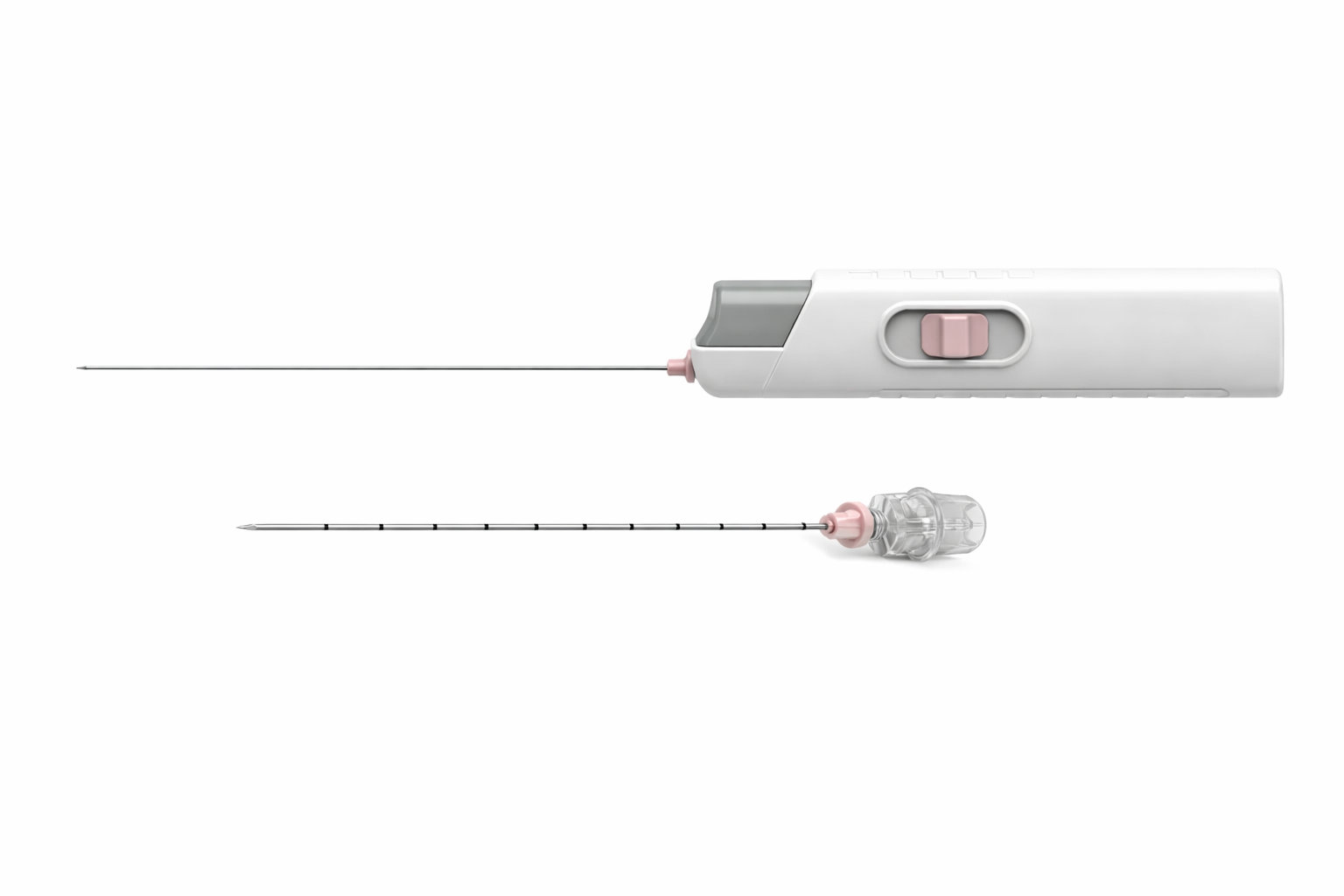 Pistolet automatique pour biopsie tissus mous (ABN) avec profondeur de pénétration de 20 mm. Chargeable d'une main (ou à deux mains), il est doté d'une canule centimétrique avec pointe échogène, et de deux boutons de tir (sur le côté et à l'arrière).